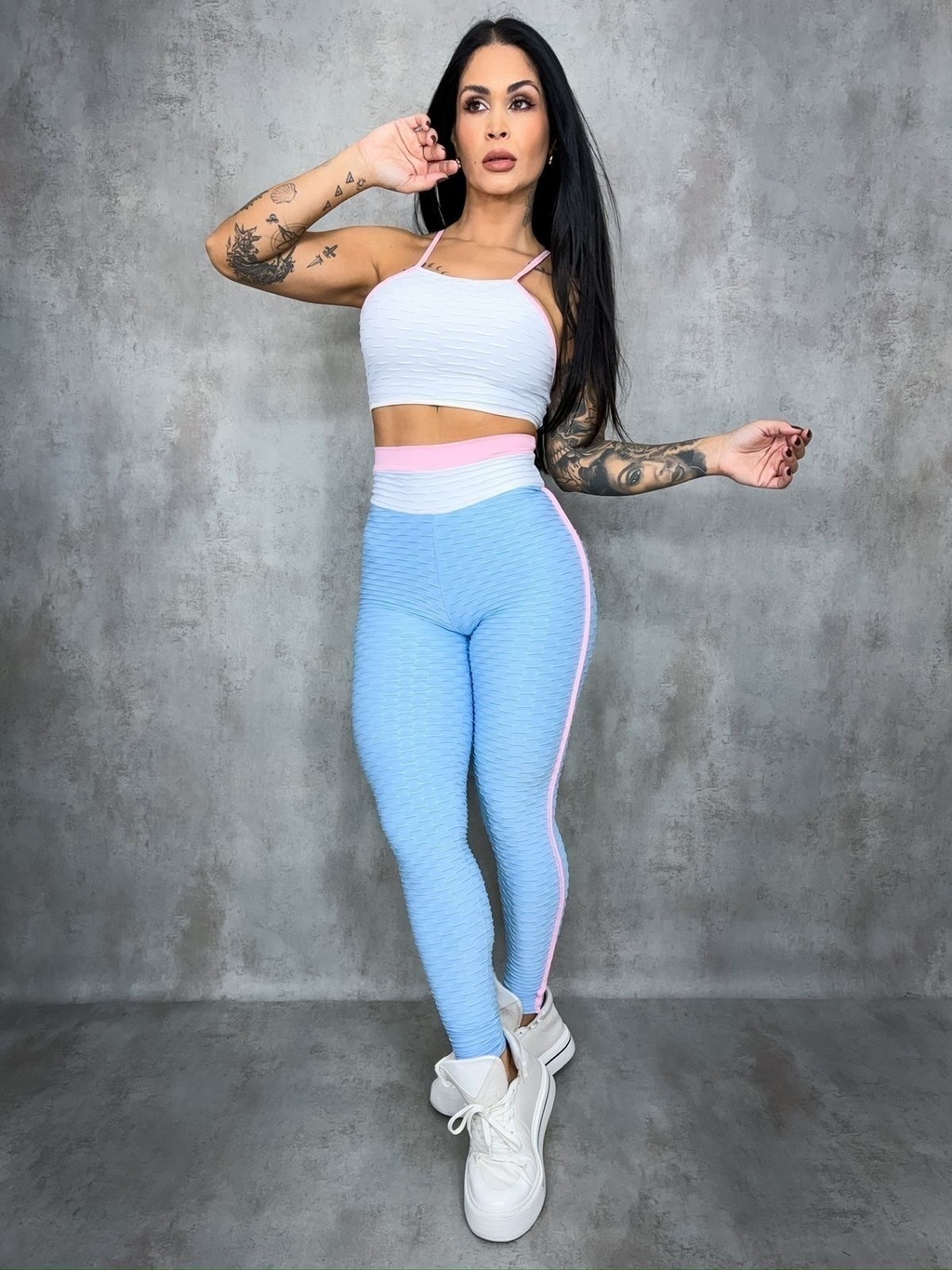 Descrição: Conjunto brocado duo rosa e azul bebê: Top com bojo removível + Legging empina bumbum.